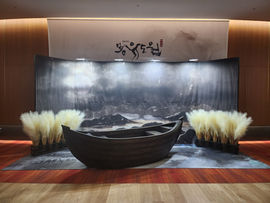 Although the stage embraces minimalism, it is in constant transformation. The throne and the Dowon altar shift laterally, boats glide across the floor, tracing fluid, shifting paths, and four layered columns move continuously to divide and reconfigure the space. Rear LED imagery reflects off the floor, blurring the boundary between physical reality and projected image. Rather than simplifying space, the design presents a world in continual creation and dissolution, visually expressing the instability of the characters’ world.